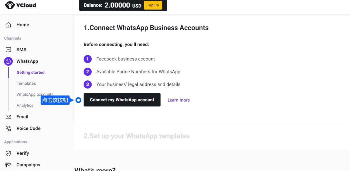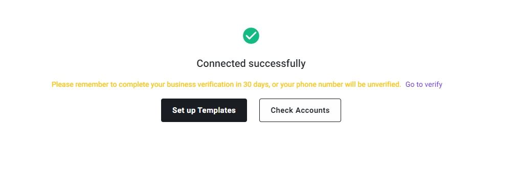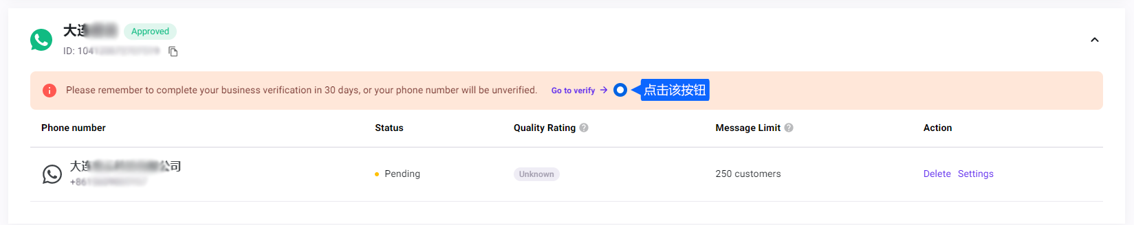 新建的商业账号需要商业账号验证,需要在30天内完成认证,否则账号失效。点击侧菜单【WhatsApp accounts】查看已经接入的账号,点击【Go to verify】进行认证。