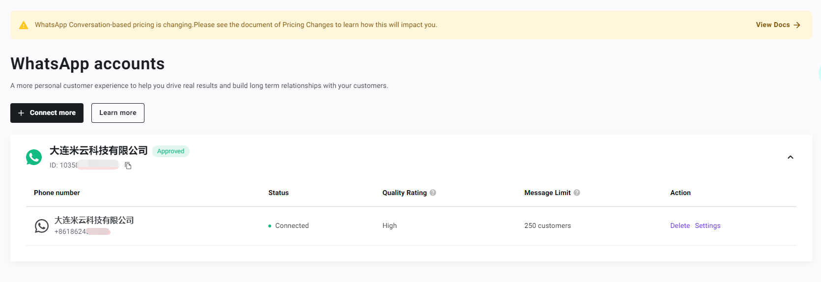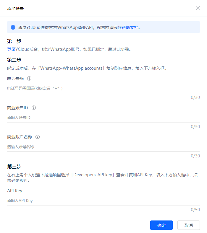 打开米多客企业版,「设置中心 - 渠道 - WhatsApp」中「账号管理 - 商业账号」点击【添加账号】,填入上面记录电话号码、账号ID、账户名称以及API Key,点击【确定】。