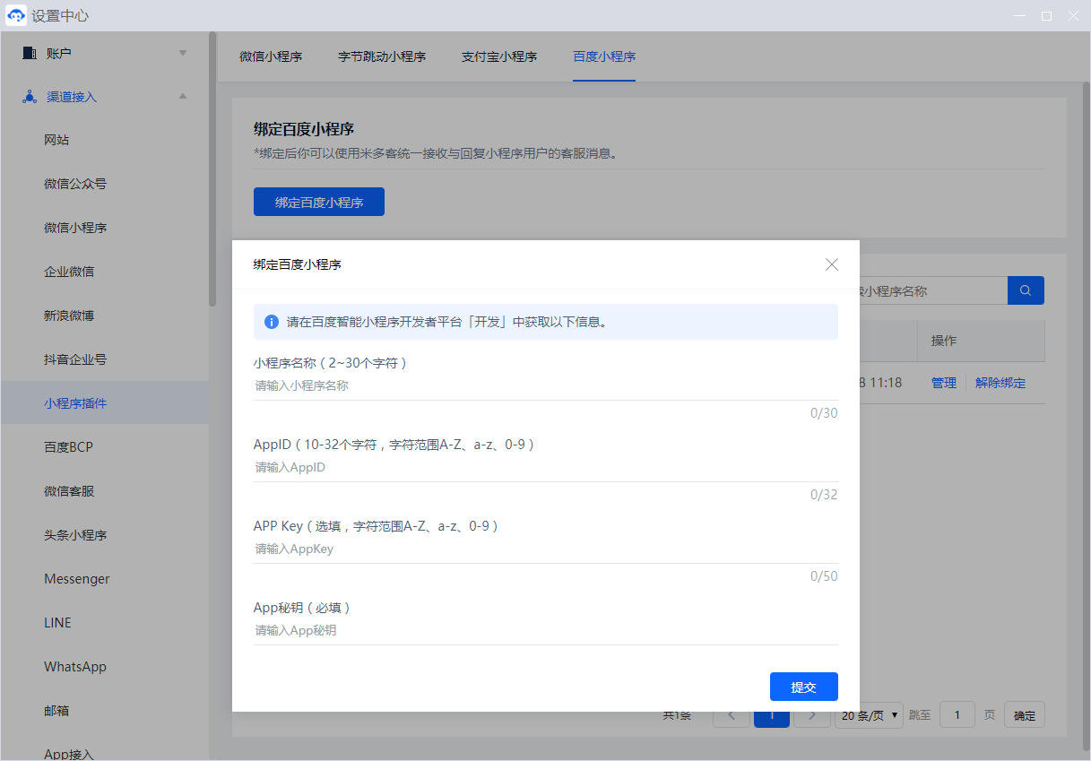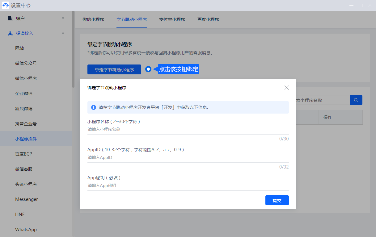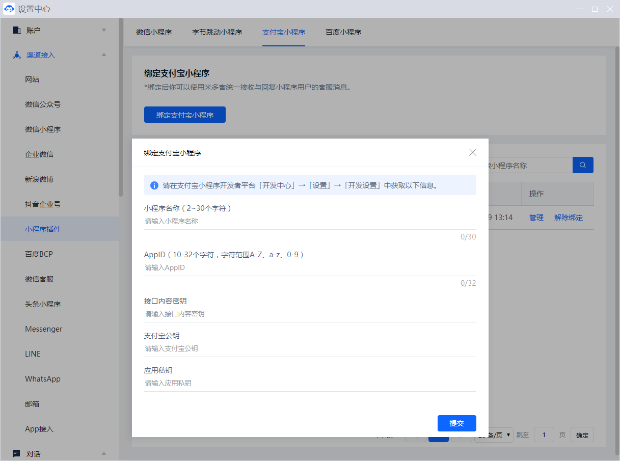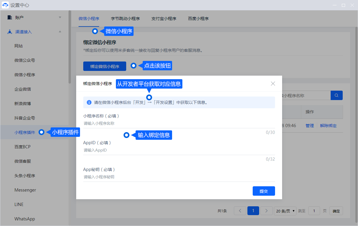 支持微信小程序、字节跳动小程序、支付宝小程序和百度小程序,绑定对应小程序参数即可接入,接入后就可以使用米多客统一接收和回复粉丝私信。