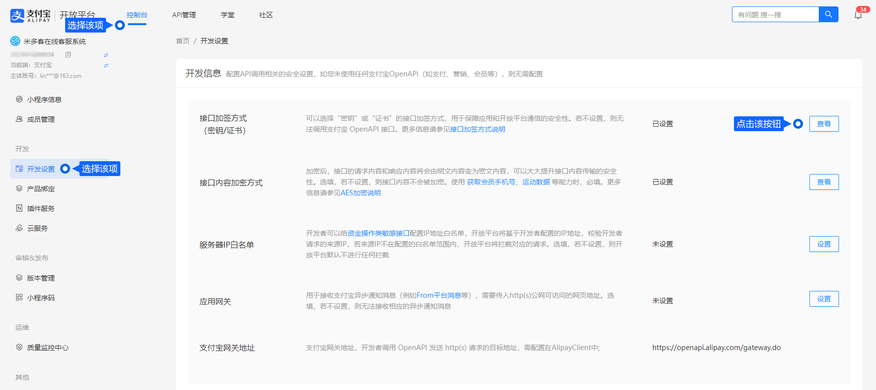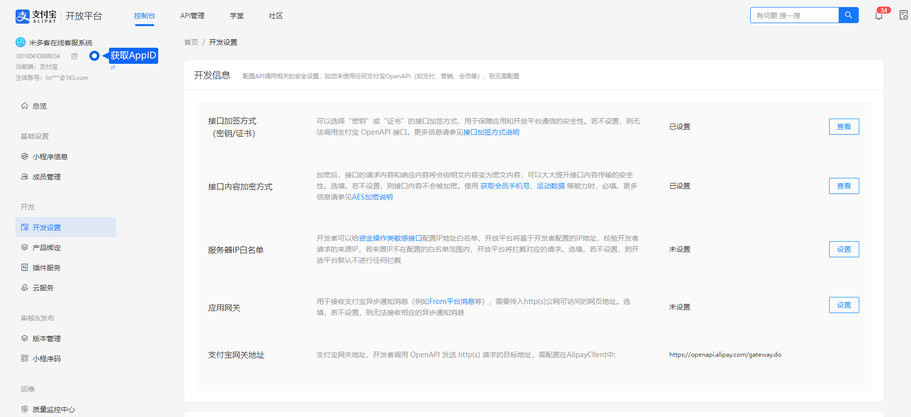 回到米多客企业版,在小程序插件里选择支付宝小程序,点击【绑定支付宝小程序】, 将上述保存的AppID、接口内容密钥、支付宝公钥、应用私钥填入到下图的文本框里,点击【提交】绑定完成。