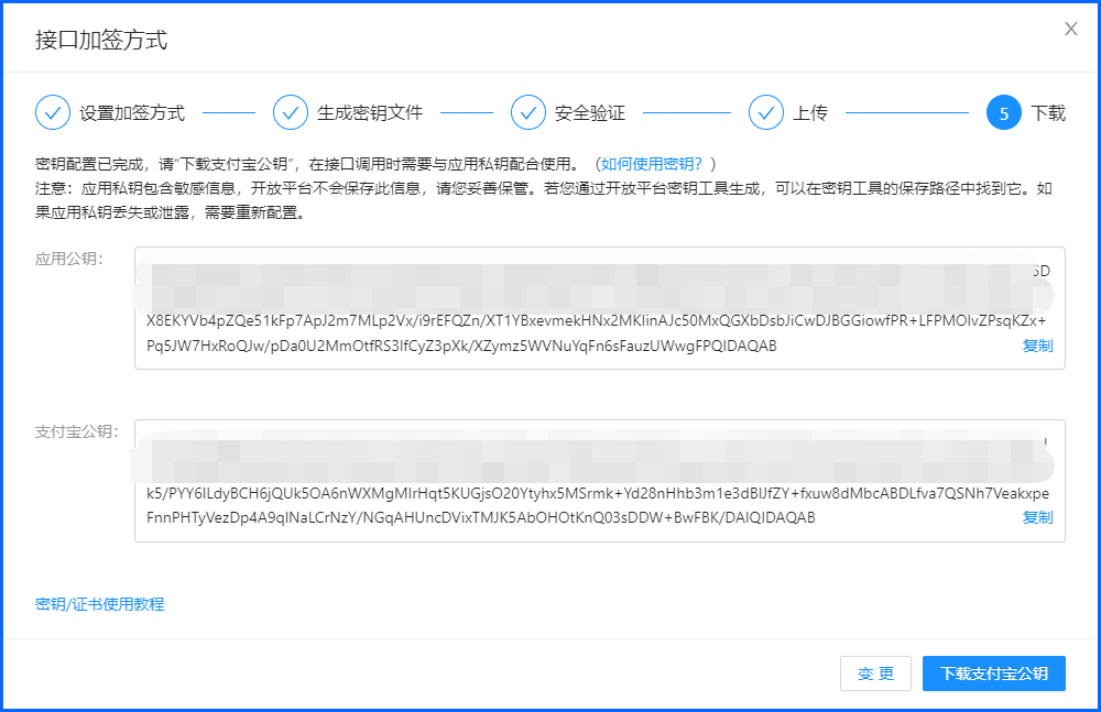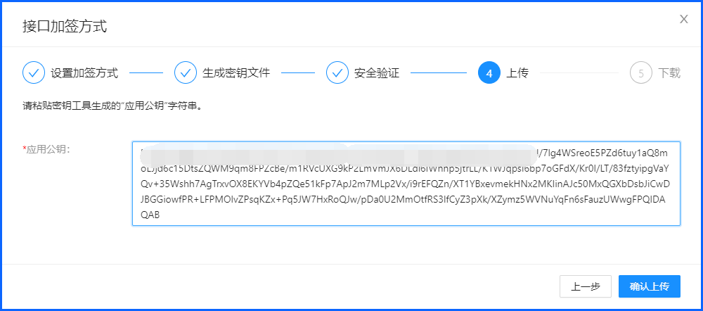将保存的应用公钥拷贝到文本框里,点击【确认上传】