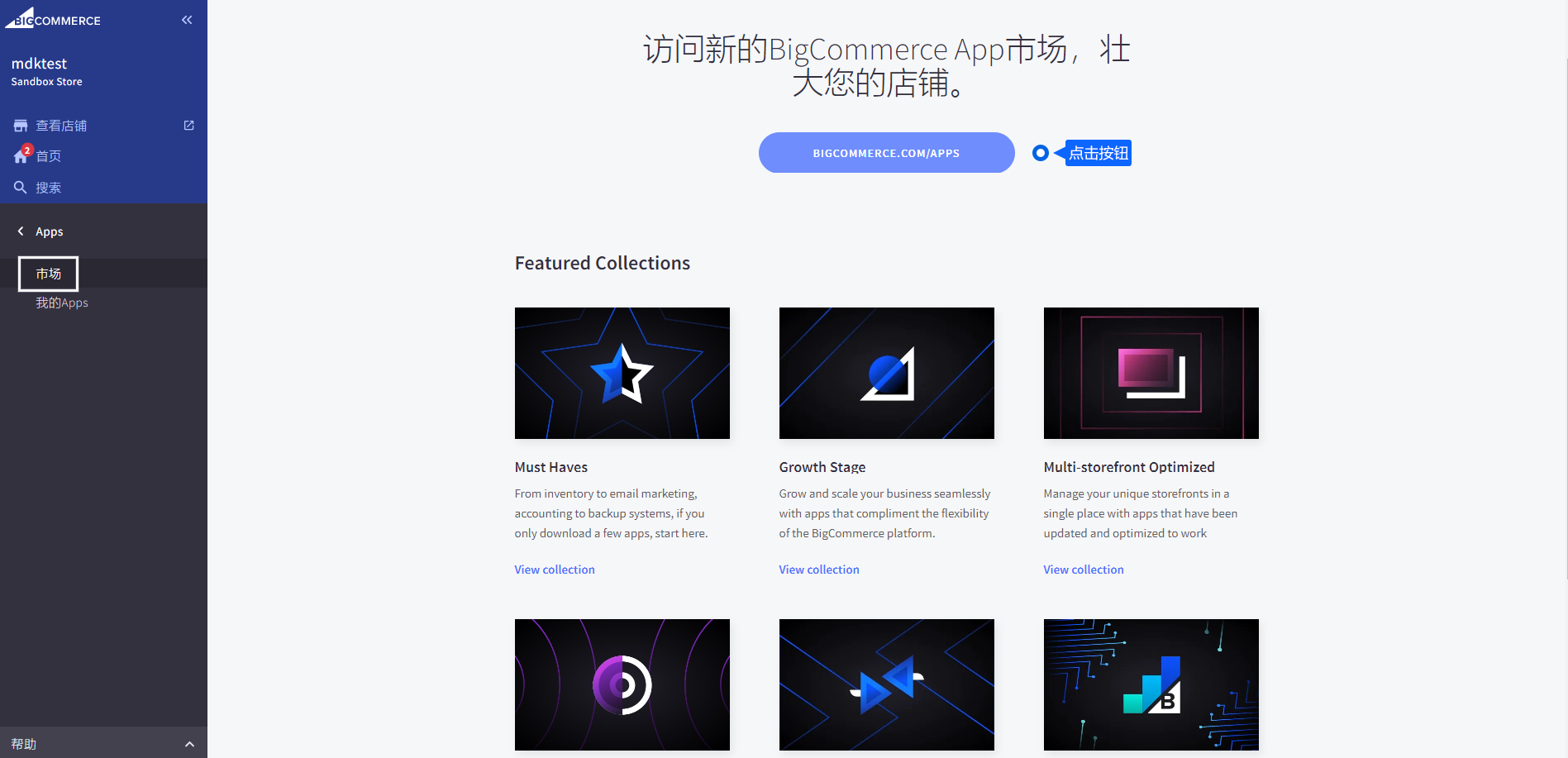 第一步:登录BigCommerce商店后台,点击【市场】进入应用市场,在显示的页面中点击【BIGCOMMERCE.COM/APPS】按钮。