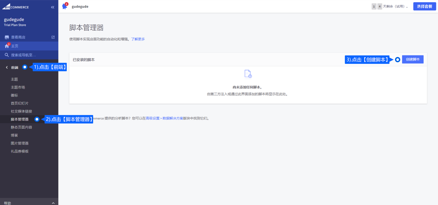 1.点击【前端】; 2.点击【脚本管理器】; 3.点击右侧【创建脚本】进入代码编辑页面