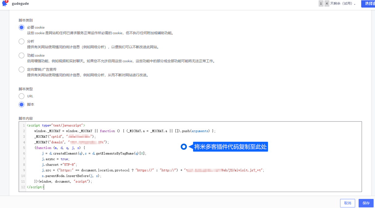 代码编辑页面,将米多客接待组件代码粘贴至【插件代码】输入框中,并点击【保存】按钮即安装米多客成功。