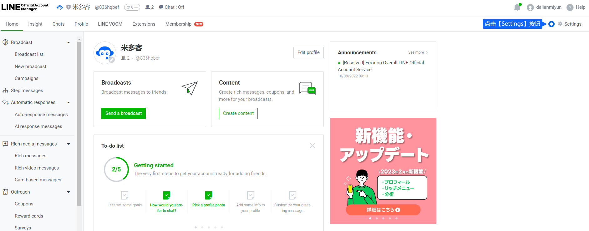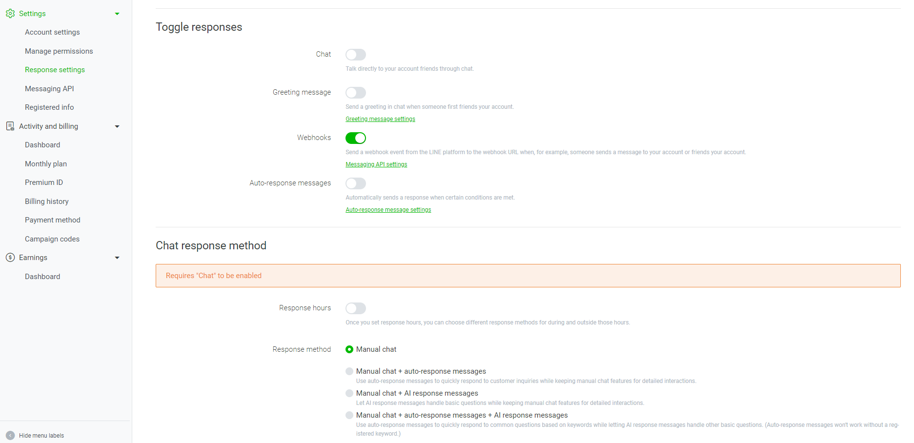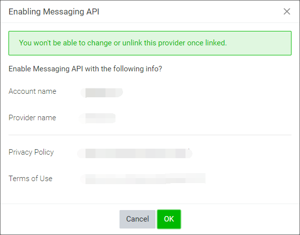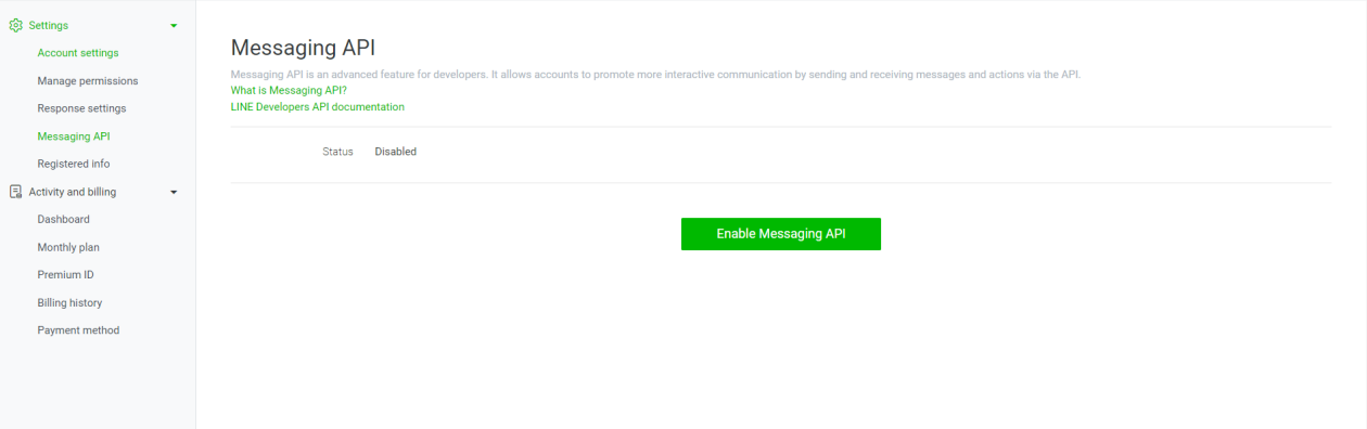 点击【Enable Messaging API】按钮,并根据提示进行设置。New provider可以填写您的企业名称。