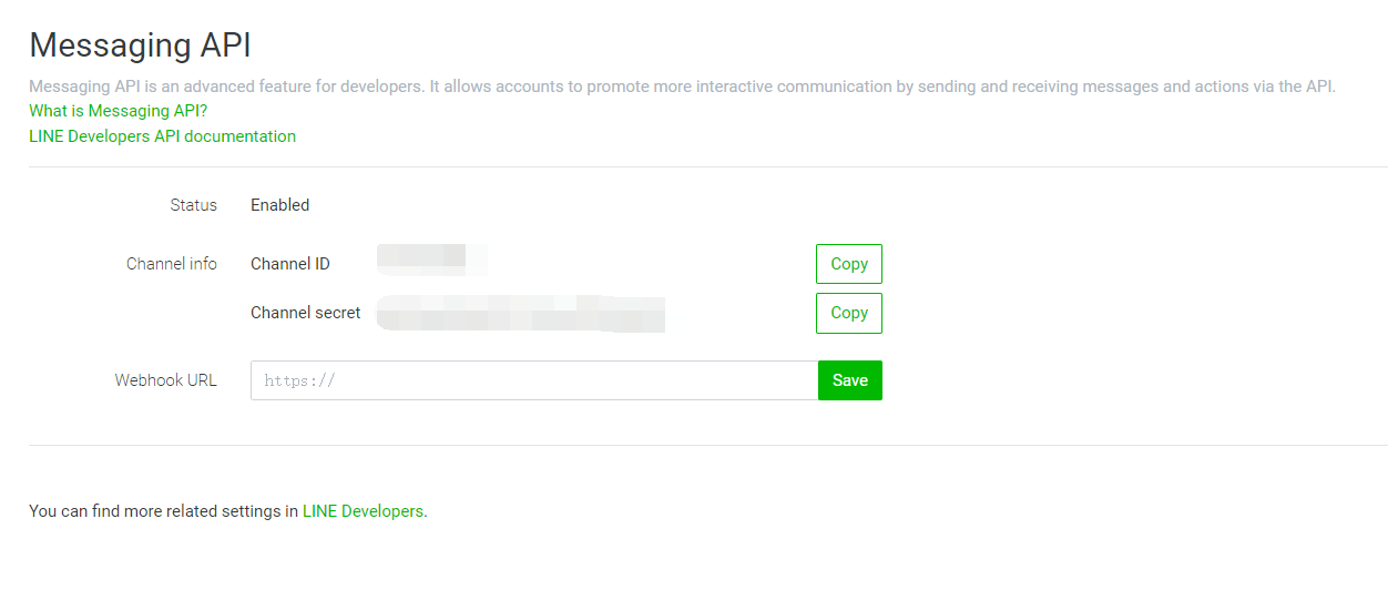 将【Channel ID】和【Channel secret】字段填写至该页面。