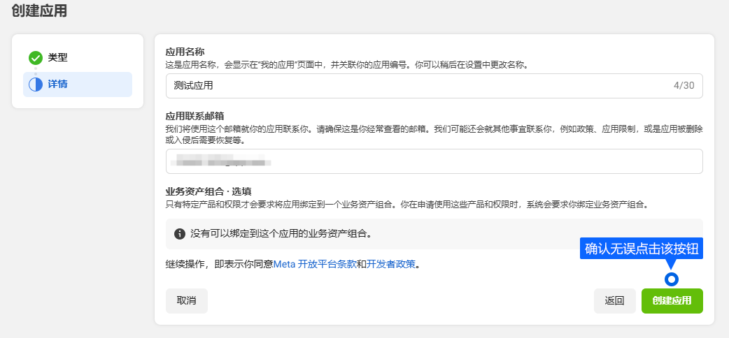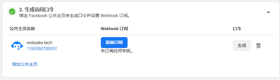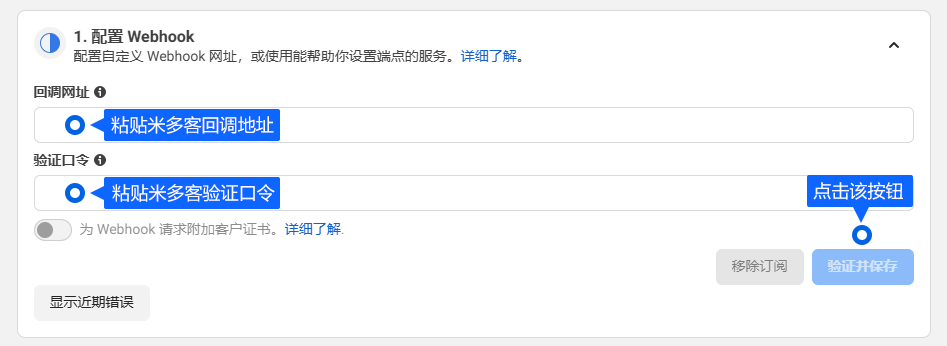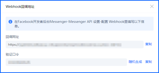 分别复制【回调地址】、【验证口令】粘贴至Facebook开发者后台【回调网址】和【验证口令】处,并点击【验证并保存】按钮。