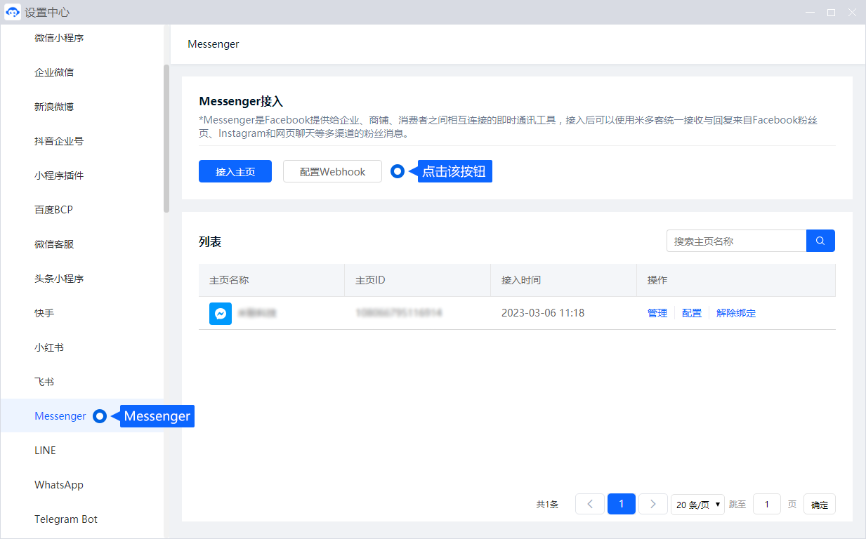 打开米多客企业版,进入「设置中心-渠道接入-Messenger」点击【配置Webhook】。