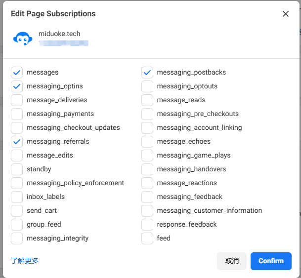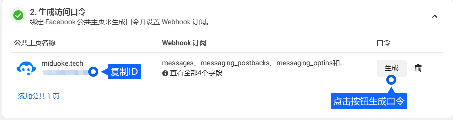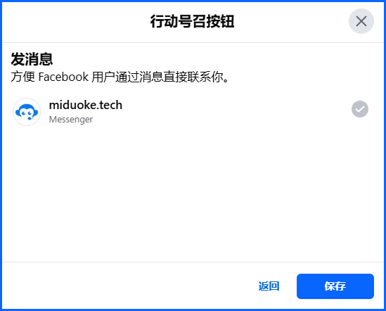 打开米多客企业版,点击「设置中心--渠道接入--Messenger--接入主页」, 把之前保存的主页ID以及口令填写到界面上,提交成功即成功接入。