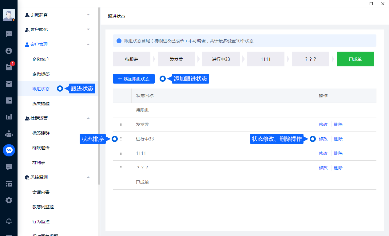 跟进状态 「企微助手 - 客户管理 - 企微标签」可进行跟进状态的创建与管理(最多设置10个状态)。 跟进状态用于「企微客户」【客户详情】页面,标识客户目前跟进状态。同时,客服成员在企业微信中,可对每位客户进行跟进状态标识。