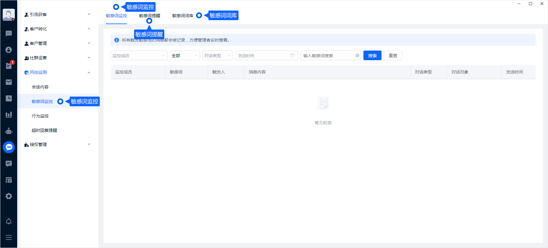 用于企业管理者查看客服或客户敏感词触发记录,企业管理者可根据时间、部门/成员名称、对话类型单聊或群聊筛选查看信息;对话类别可分为单聊、群聊;也可以直接输入敏感词直接搜索。