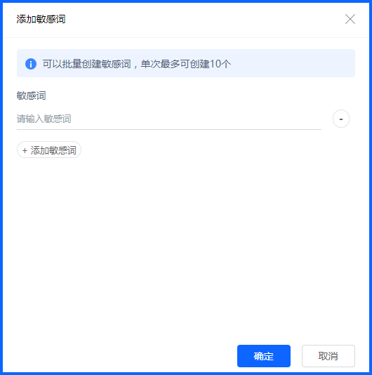 添加敏感词时,可以批量创建敏感词,单次最多可创建10个