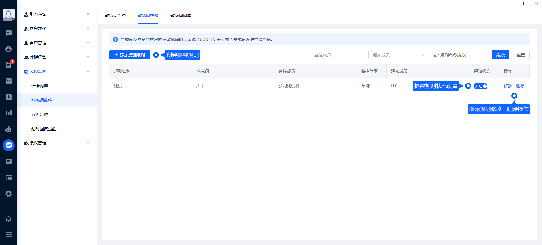 敏感词提醒列表页,可以对敏感词规则进行管理,可随时修改提醒规则、更改提醒规则通知状态,如开启或关闭,以及删除规则等。