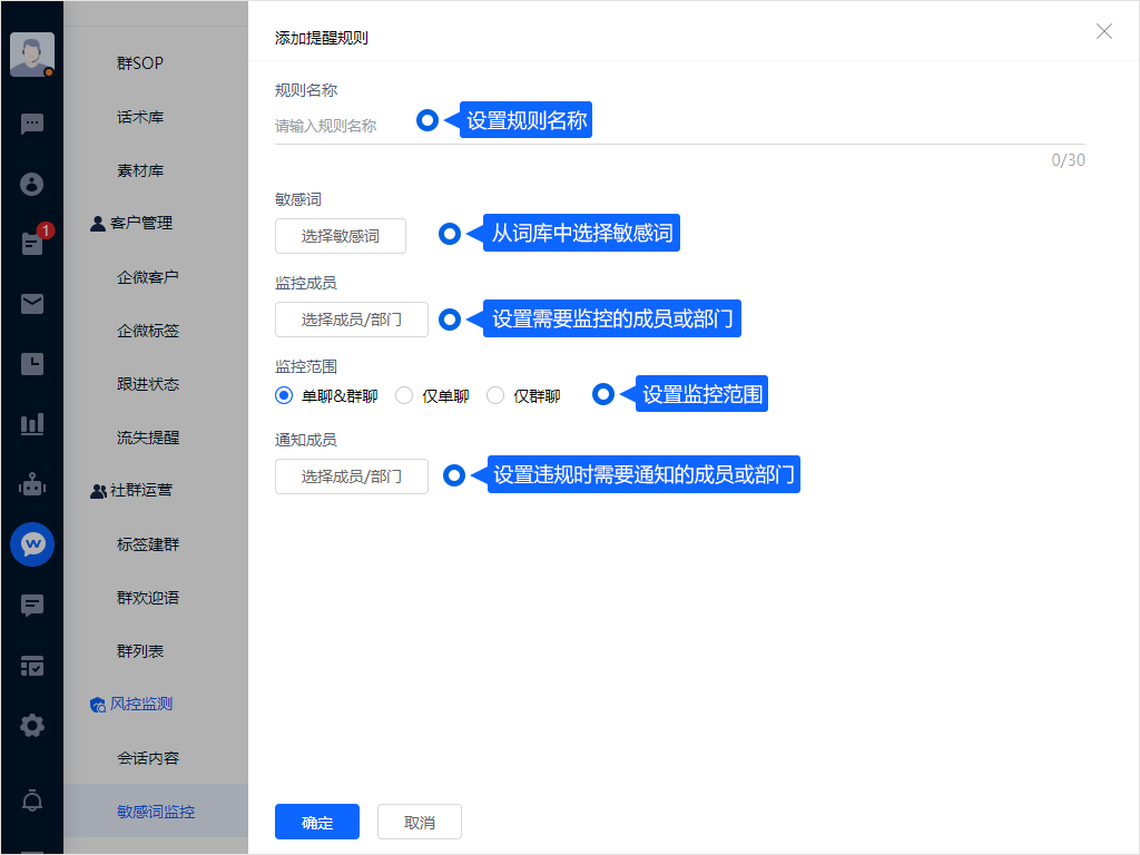- 监控成员:设置需要监控的客服成员或部门,当客服成员或成员的客户,在对话内容中涉及敏感词时,将触发提醒规则;