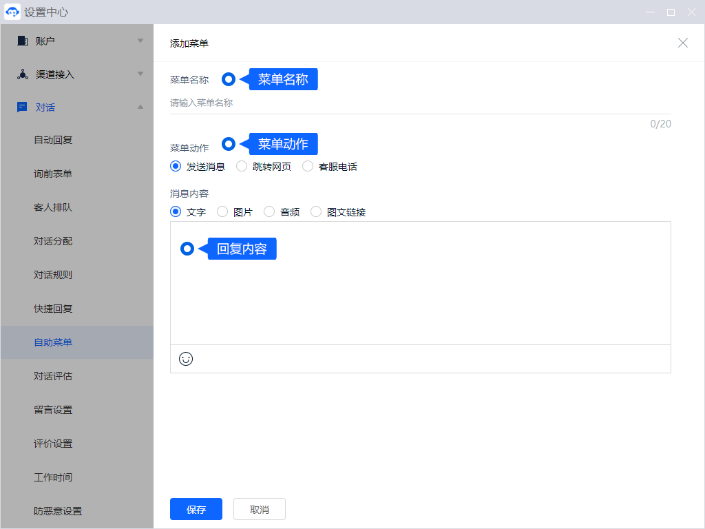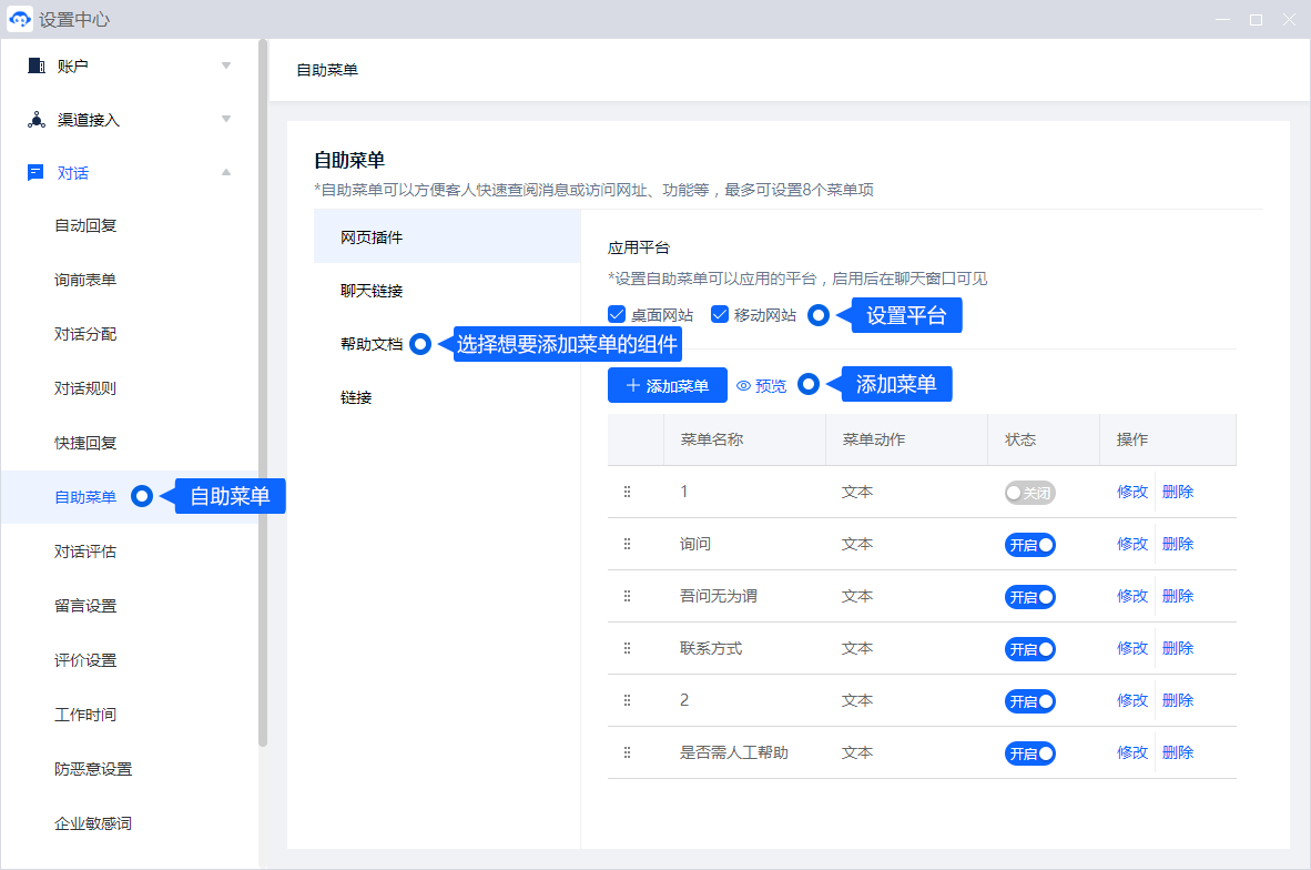 电脑登录客服工作台,在「设置中心 - 对话 - 自助菜单」中进行配置。