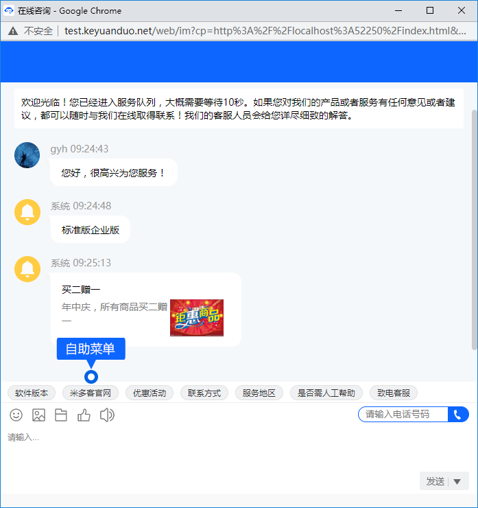 自助菜单会持续的显示在聊天窗口底部,并横向展现,方便客人点击实现自动回答。